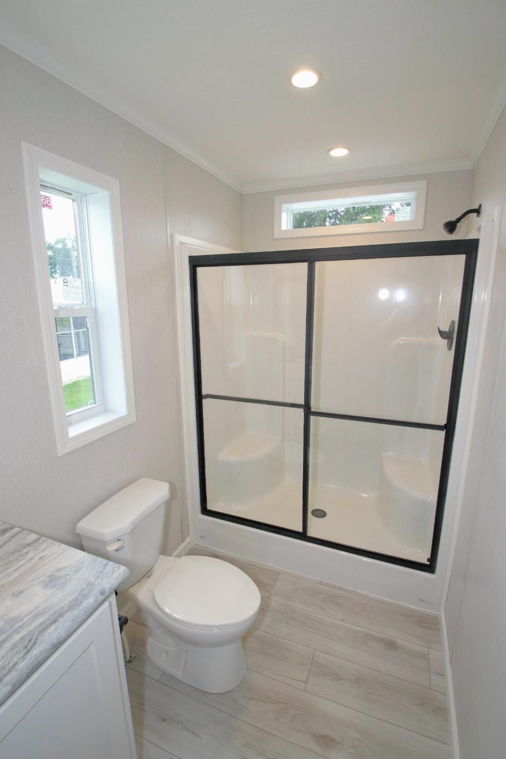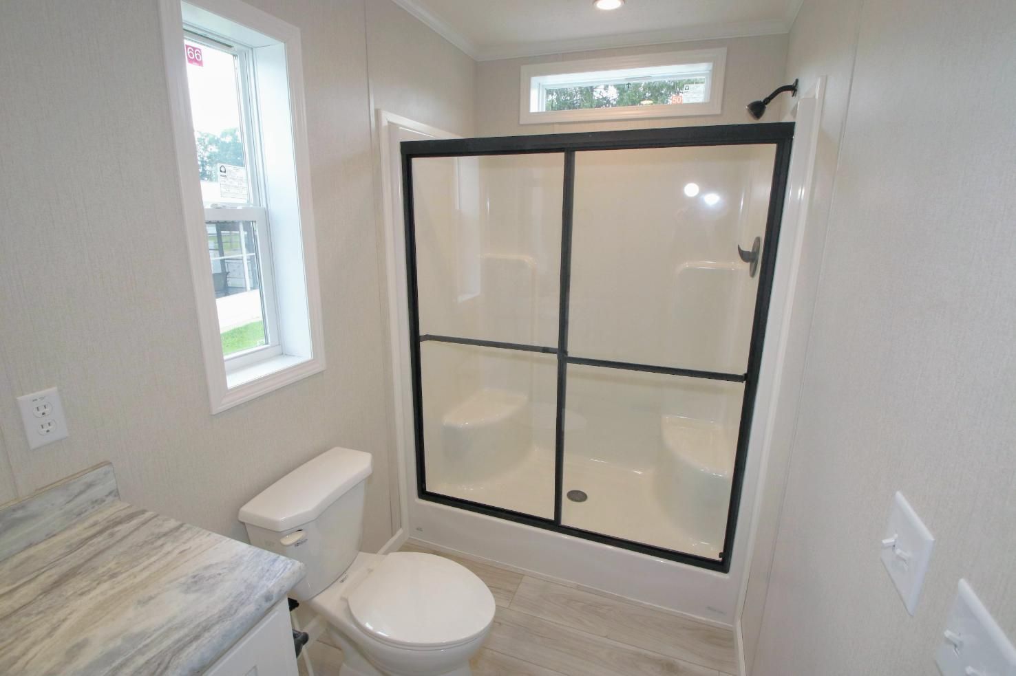 - One Piece Fiberglass Shower Stall with Glass Sliding Door